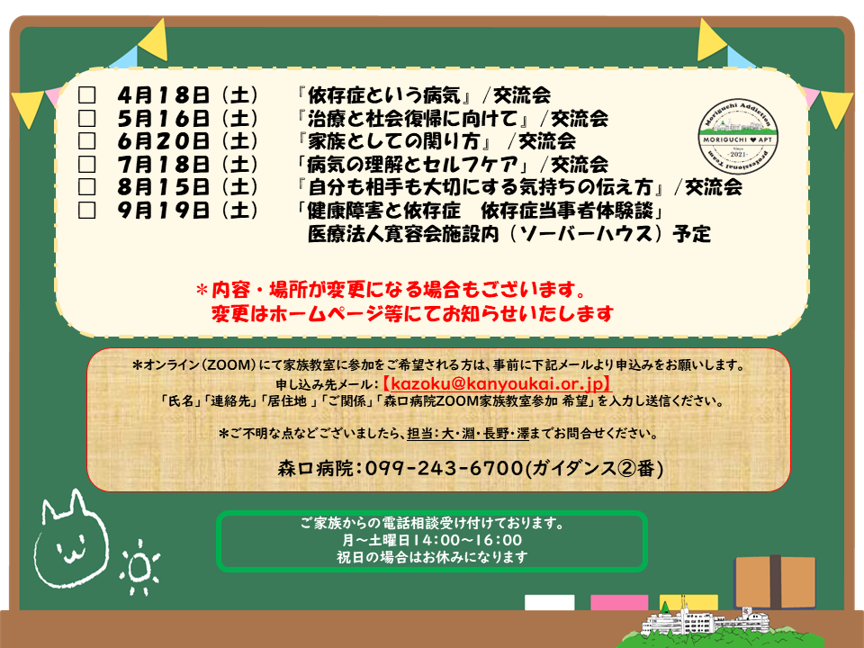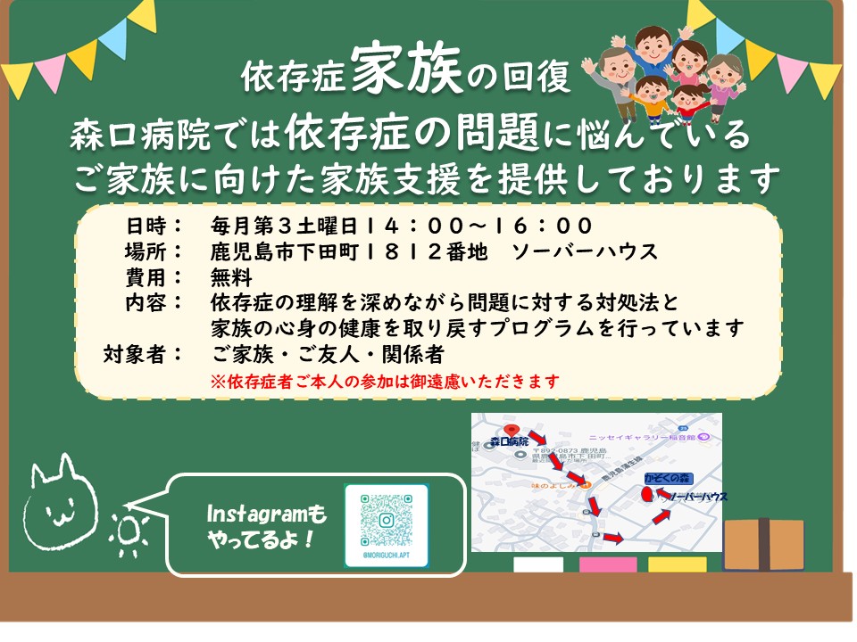 今まで参加されたご家族からは、「心が軽くなった。」「依存症のことが知れてよかった。」などの言葉を頂きました。ファミリーサポートかぞくの森が、家族の心の健康を取り戻すための場となれば幸いです。