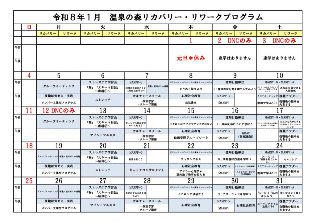 令和8年1月のプログラムカレンダーです!