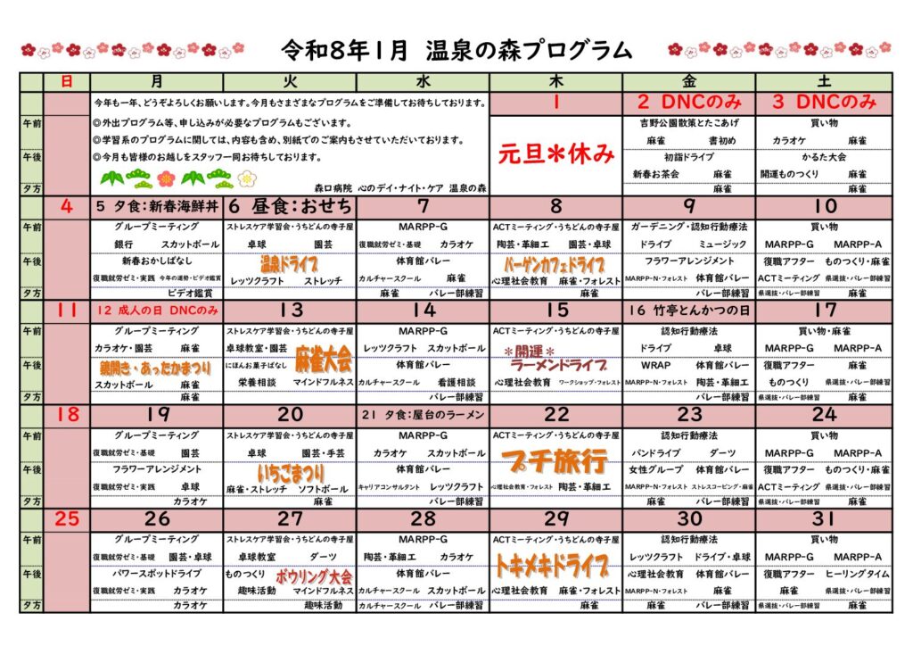 1月も様々なプログラムを準備し、治療プログラムも行います!不明な点は温泉の森へお問い合わせください。尚、通常営業は1月5日(月)からとなります。時間などのご質問も不明な点はお問い合わせください。