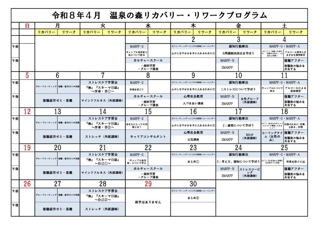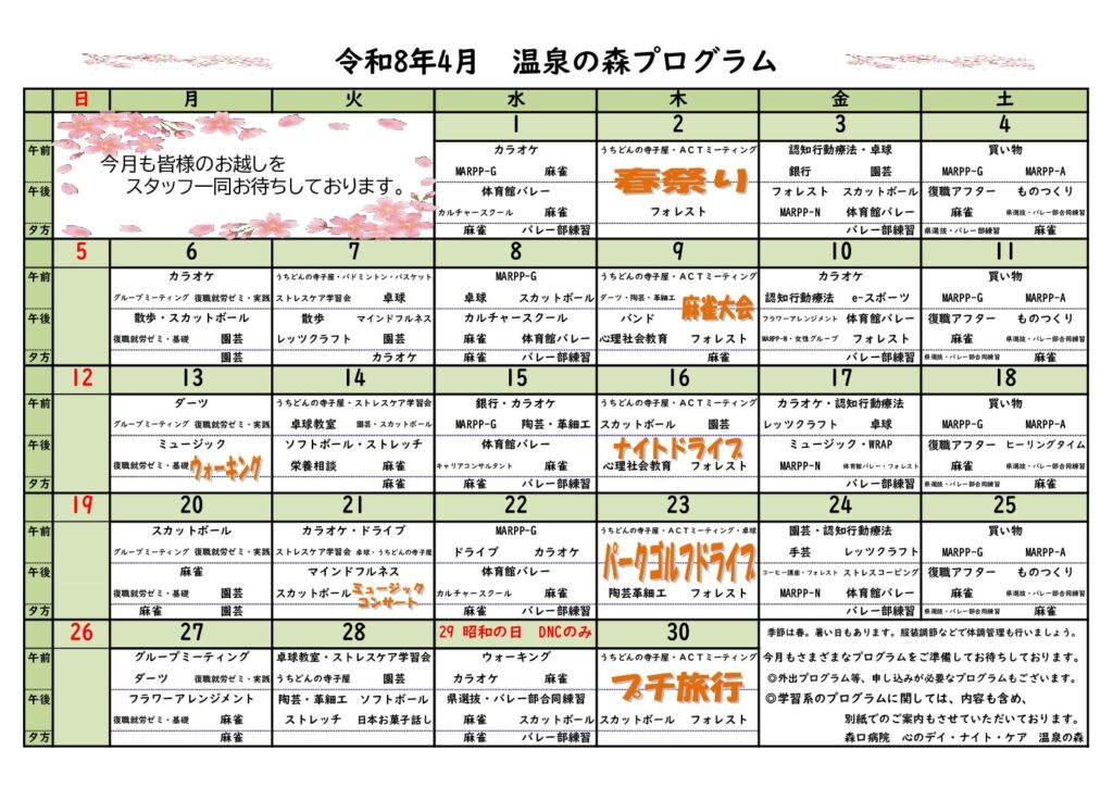 4月のプログラムでも春にちなんだ行事なども開催しますので、参加希望の方はポスターへの記名やお問い合わせをしてみてください!!