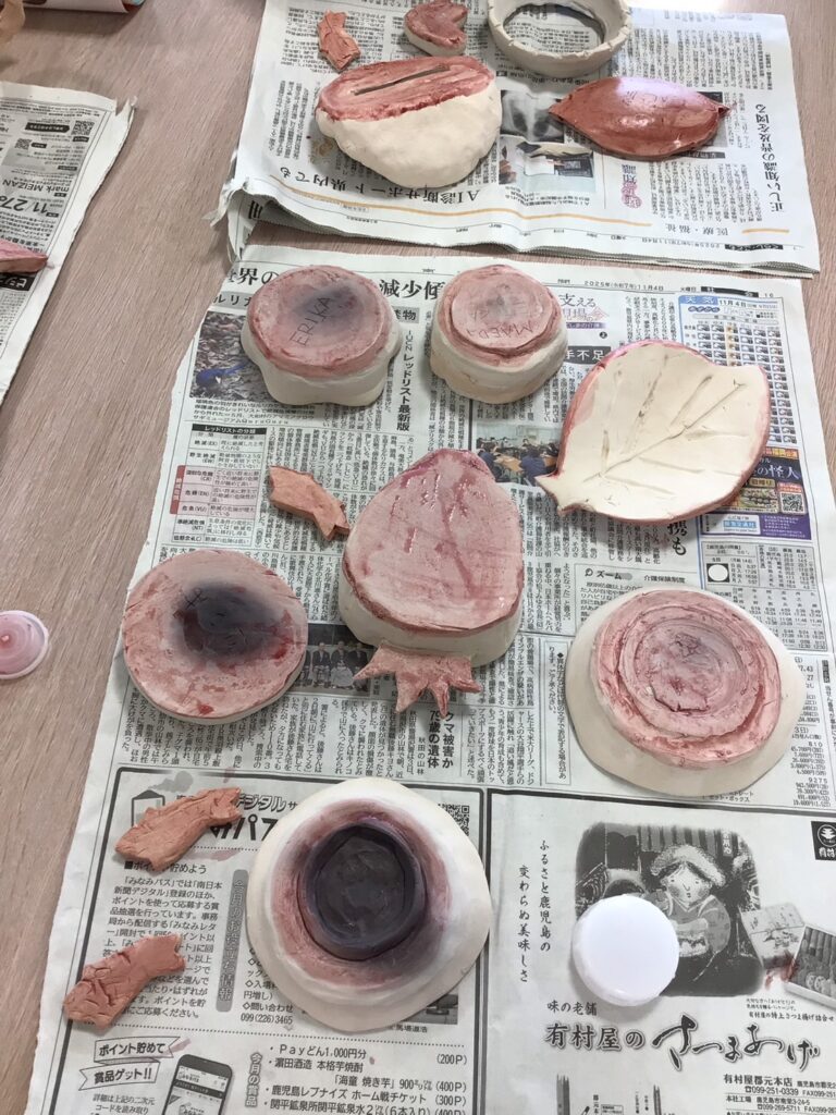 粘土をコネコネ形を作り丁寧に色付けした陶芸作品が、、、