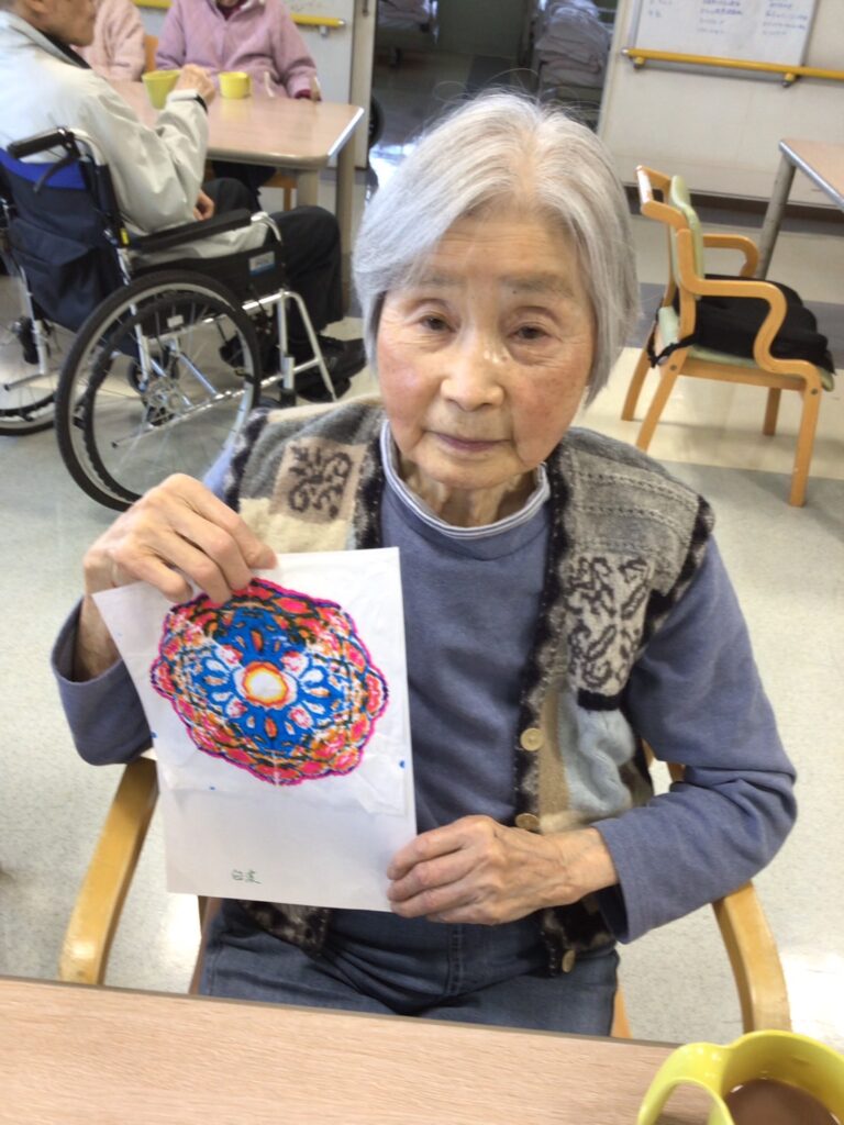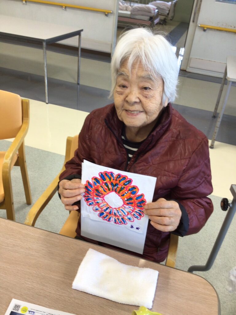 ティッシュペーパーを折りたたんでサインペンで色付けを行いましてティッシュを広げたら綺麗な模様の完成🌼